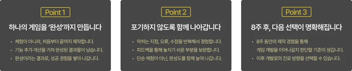 코드를 외우기보다, 게임이 만들어지는 사고 과정과 구조를 중심으로 경험합니다.